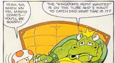 Yes, I'm aware this is a MatPat theory. My specific reasonings and conclusions are mostly different, though.I think the entire feud between the Mushroom Kingdom and the Koopa Kingdom is a sort of Capulets-and-Montagues situation, where the conflict is only just bad blood between the Mushroom King (Peach's father) and Bowser's father.This whole headcanon started with a small detail from a single Mario comic, where it's revealed that Bowser's very-absent father is an infamous criminal in the Mushroom Kingdom. The exact quote is below.Peach and Bowser are both reasonable enough to see that the feud is doing far more harm than good to both sides, and arrange an Alliance in secrecy, keeping up the whole charade to prevent the Mushroom King from working out what's going on.Some other general evidence I cite for this;